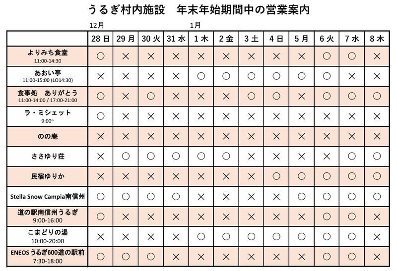 年末年始期間中の村内施設の営業は以下の通りとなります。