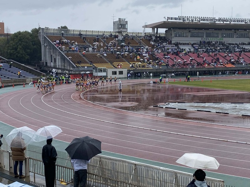 雨の中、スタンドで待つこと約2時間、学法石川の最終ランナーが1位でグラウンドに姿をあらわし会場のボルテージが上がります。優勝候補の一角、佐久長聖高校は10位と残念な結果となりました。