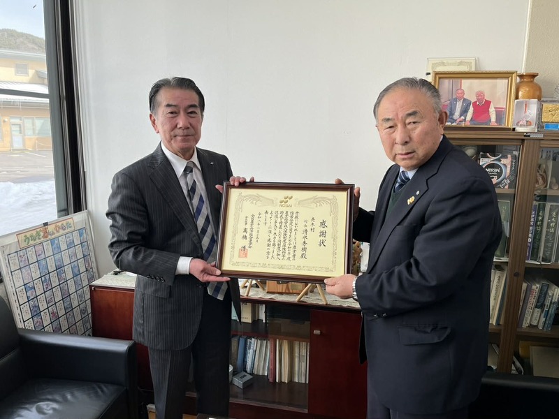 全国農業共済組合連合会から、農業者の経営安定のための農業保険加入に助成金を村が出し、加入促進を図っている事への感謝状をいただきました。